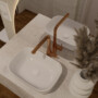 Kluczem do sukcesu okazało się potraktowanie zastanych warunków jako punktu wyjścia do stworzenia idealnie dopasowanego, ergonomicznego układu. W ten sposób powstała w pełni funkcjonalna aranżacja łazienki, która wykorzystuje każdy centymetr dostępnej przestrzeni. Finalny charakter wnętrza definiuje ponadczasowa paleta materiałów. Bazą stał się ciepły, neutralny odcień beżu, który tworzy spokojne tło dla całej aranżacji. Skontrastowaliśmy go z naturalnym ciepłem drewna, widocznym na posadzce oraz w strefie mokrej prysznica. Sercem projektu stały się jednak detale w kolorze miedzi. Szlachetny, ciepły połysk armatury i akcesoriów dodał wnętrzu elegancji i unikalnego charakteru, tworząc spójną i luksusową przestrzeń.